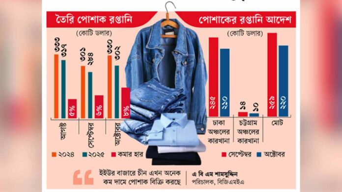 বিজিএমইএর পরিচালক ও হান্নান গ্রুপের ব্যবস্থাপনা পরিচালক এ বি এম শামসুদ্দিন জানান, রপ্তানি কমে যাওয়ার প্রধান কারণ হলো চীনের আগ্রাসী রপ্তানি ও মার্কিন বাজারে বেশি শুল্ক। চীনের নেভার আউট অব স্টক (এনওএস) পণ্য এবং ফ্যাশন পণ্য সারা বছর চালু থাকে। এ কারণে চীনের জন্য বাজার দখল করা সহজ। তাদের নিজস্ব কাঁচামাল ও লিড টাইমের সুবিধা রয়েছে, যা বাংলাদেশের তুলনায় এগিয়ে।