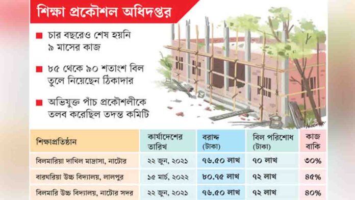 স্কুল-কলেজ ও মাদ্রাসার একতলা ভবন নির্মাণে সময় বেঁধে দেওয়া হয়েছিল ৯ মাস। কিন্তু শিক্ষা প্রকৌশল অধিদপ্তরের (ইইডি) অধীনে এসব ভবন নির্মাণকাজ চার বছরেও শেষ হয়নি। কাজের বড় অংশ ফেলে রাখা হলেও ঠিকাদাররা বিলের ৮৫ থেকে ৯০ শতাংশ পর্যন্ত তুলে নিয়েছেন। নিম্নমানের কাজ, অর্ধসমাপ্ত ভবন, অতিরিক্ত বিলসহ বিভিন্ন অনিয়মে ঠিকাদার ও প্রকৌশলীর যোগসাজশে কয়েক কোটি টাকা আত্মসাতের অভিযোগ উঠেছে।