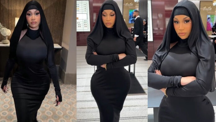 ভিডিওতে দেখা গেছে, কার্ডি বি একটি সম্পূর্ণ কালো, মেঝে-ছোঁয়া পোশাক পরেছিলেন, যার সঙ্গে ছিল উঁচু হল্টার নেকলাইন, লম্বা কালো গ্লাভস এবং তার কাঁধের ওপর একটি ম্যাচিং হুড। পরে রিয়াদের সোলিতায়ার মলে একই পোশাক পরে তাকে দেখতে পান ভক্তরা।
